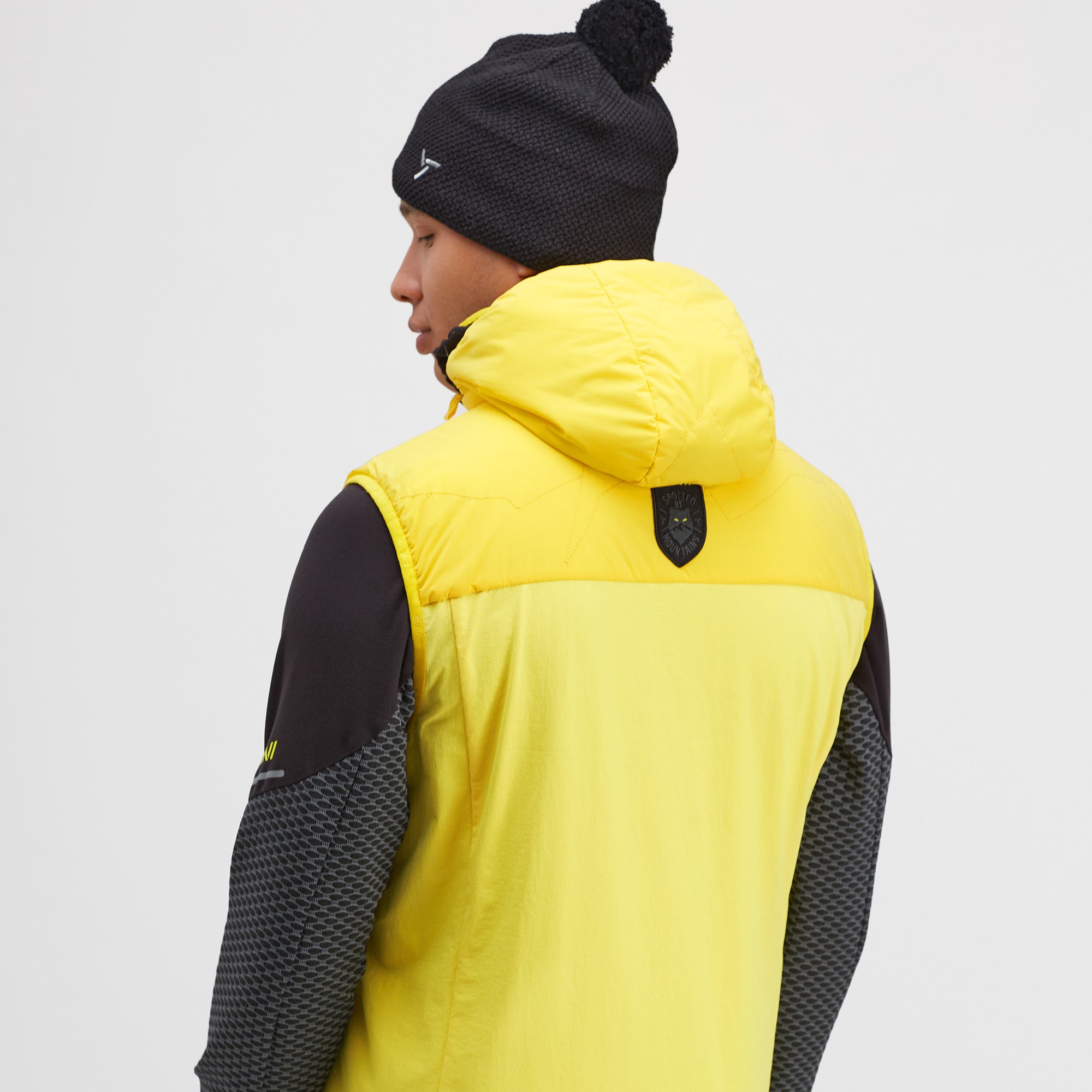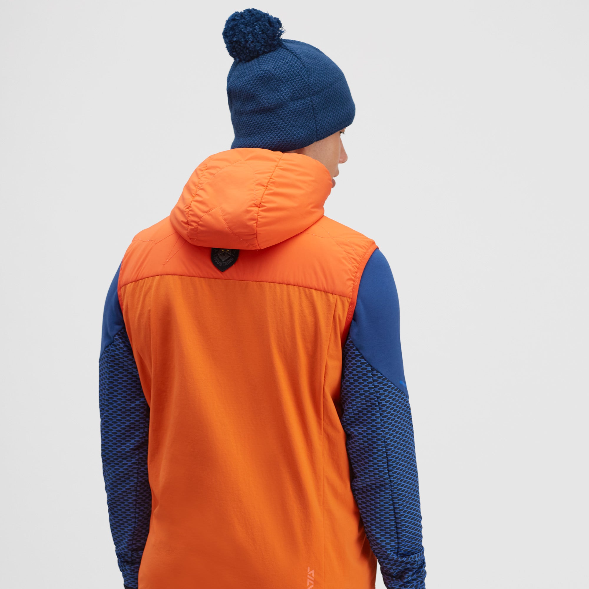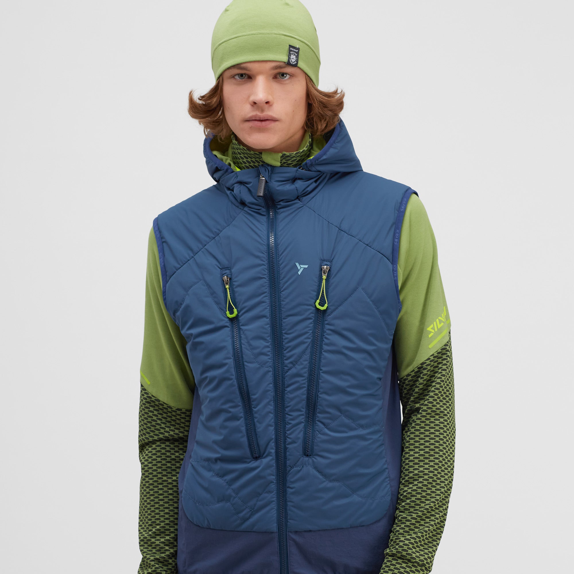 Men's insulated ski touring vest with detachable hood and pockets for climbing skins. It is made of windproof Windbreaker material and QuatroFLEX Shell with Primaloft® Gold Insulation Active 40 g insulation.