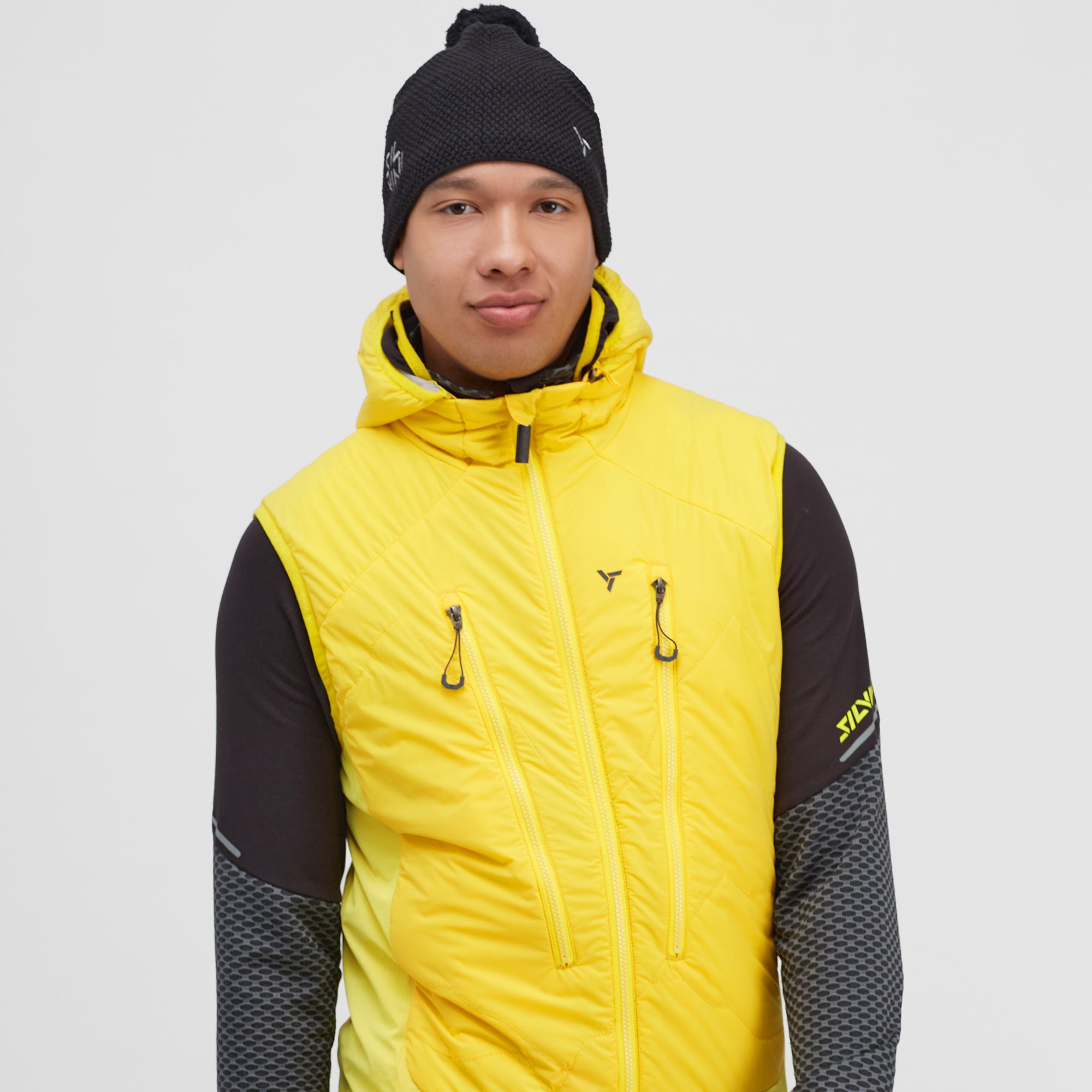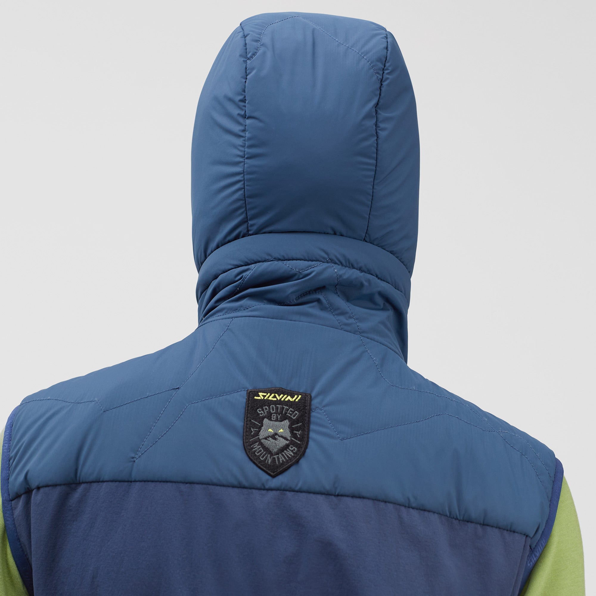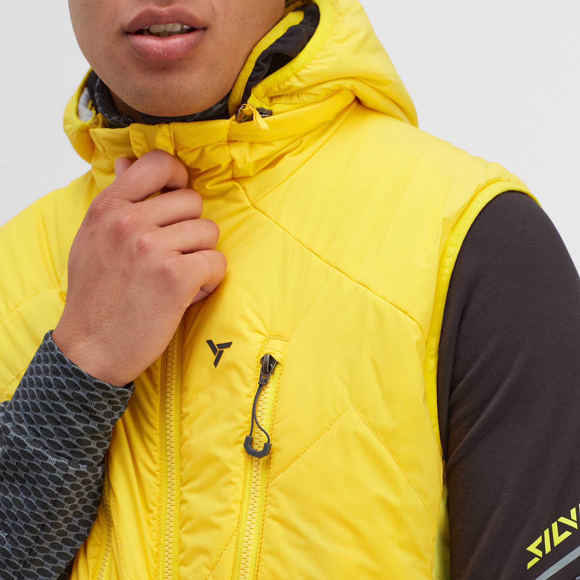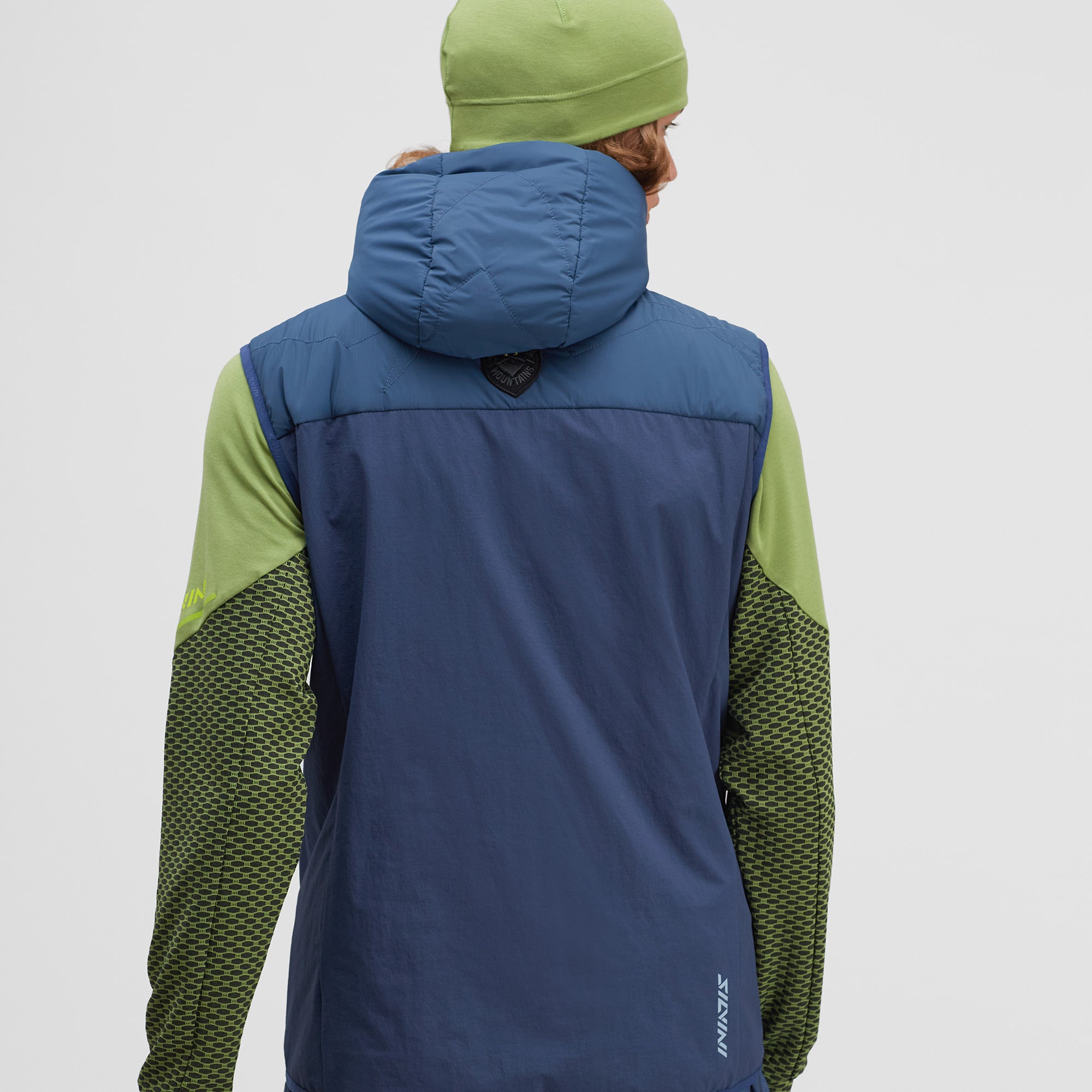 Men's insulated ski touring vest with detachable hood and pockets for climbing skins. It is made of windproof Windbreaker material and QuatroFLEX Shell with Primaloft® Gold Insulation Active 40 g insulation.